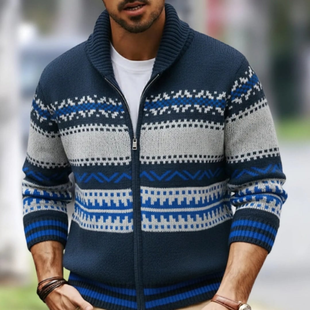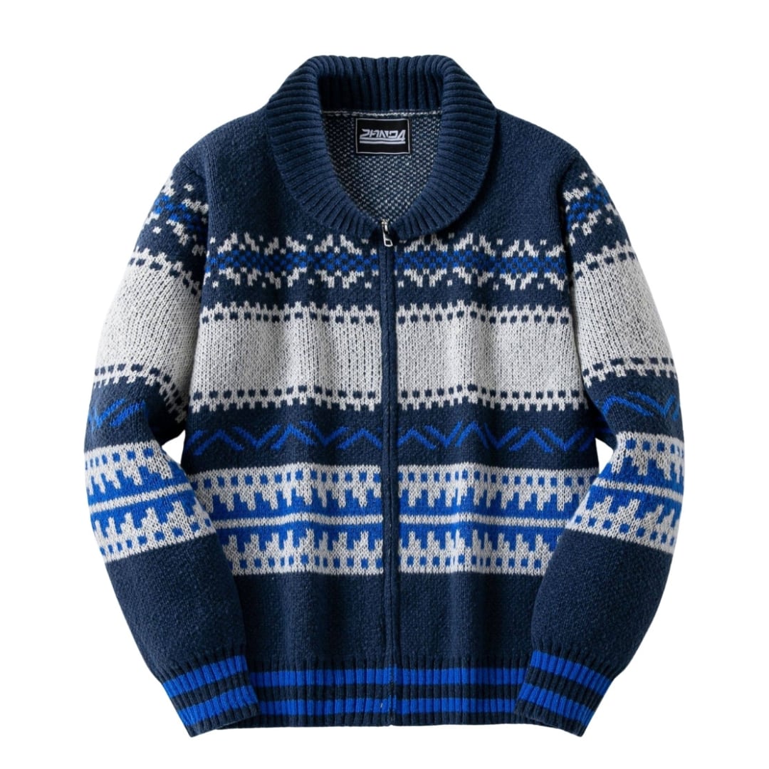 リズムのあるジャガード柄を全体にあしらった、存在感のあるジップアップニット。