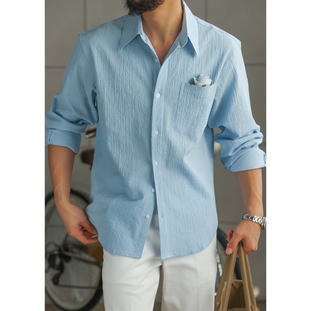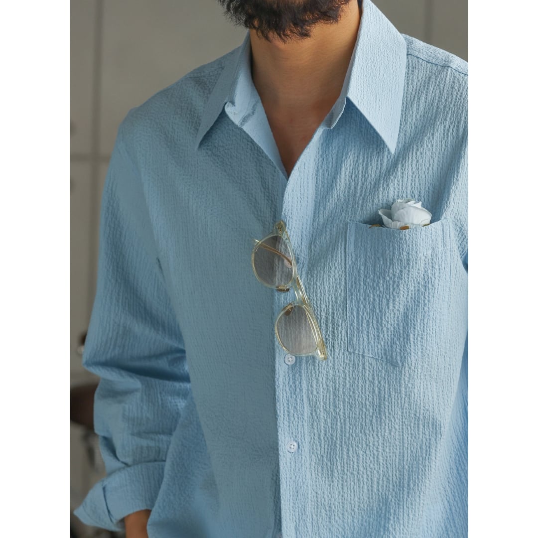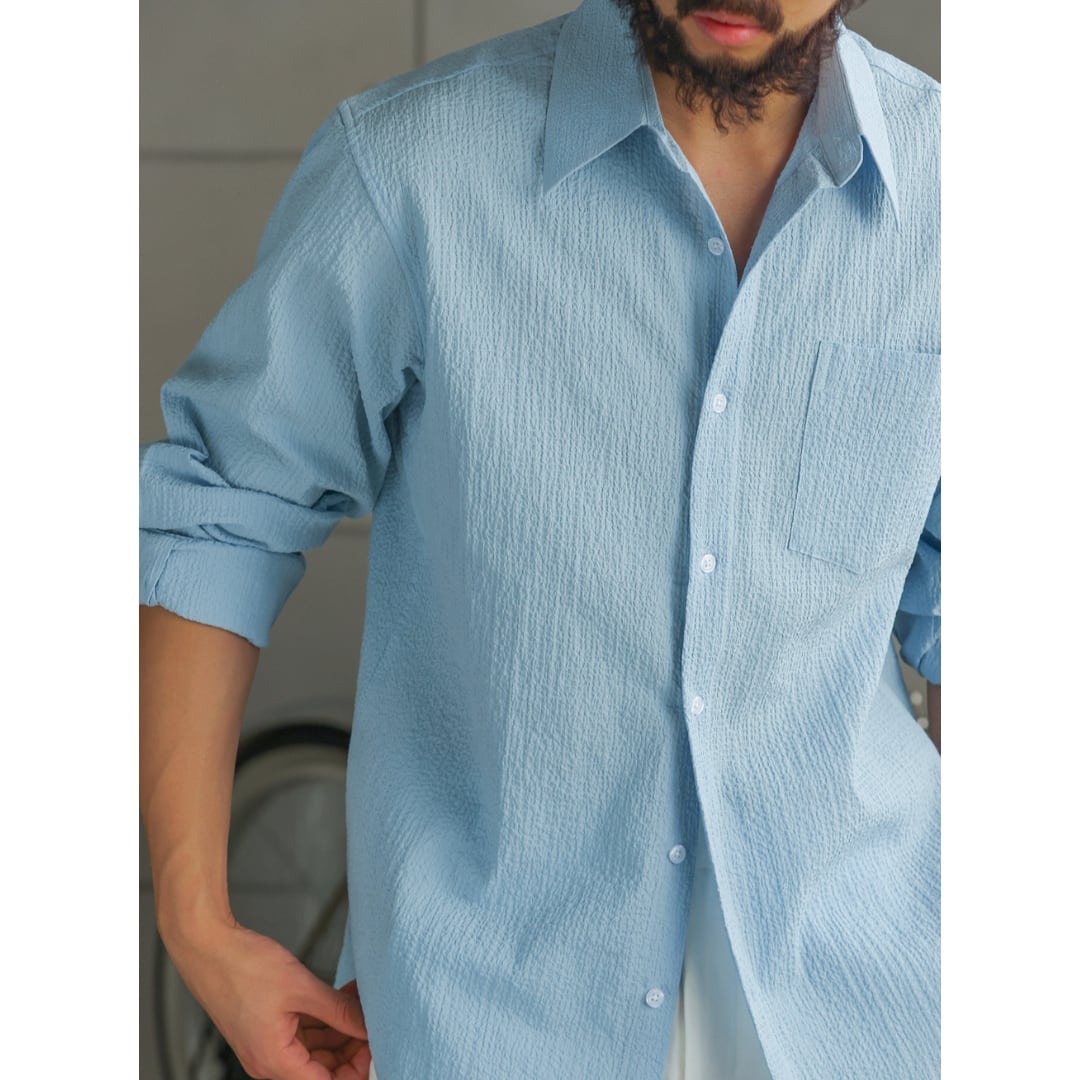 表情のある凹凸生地が肌離れを良くし、軽く涼しい着心地を実現したライトシャツ。
