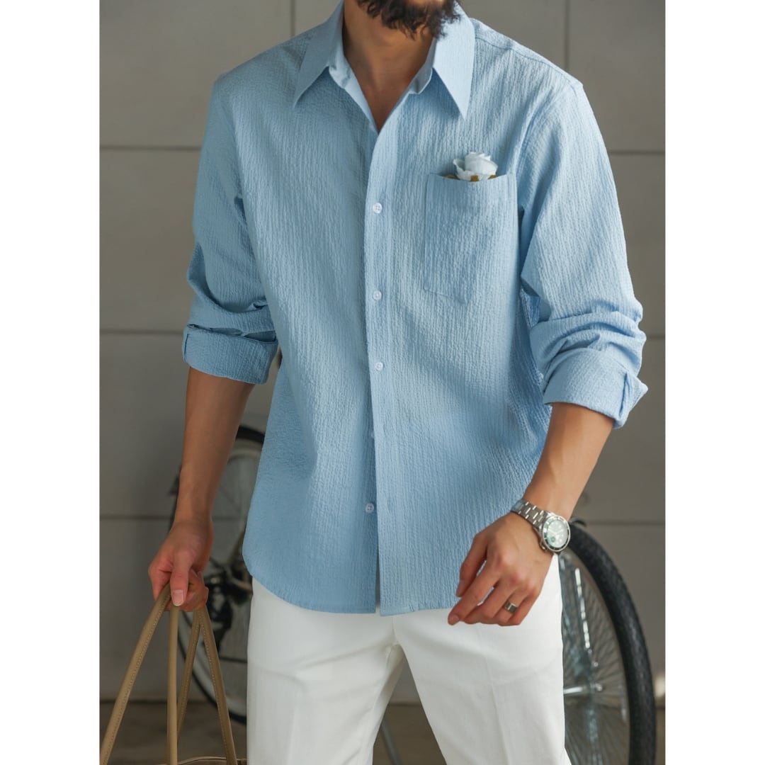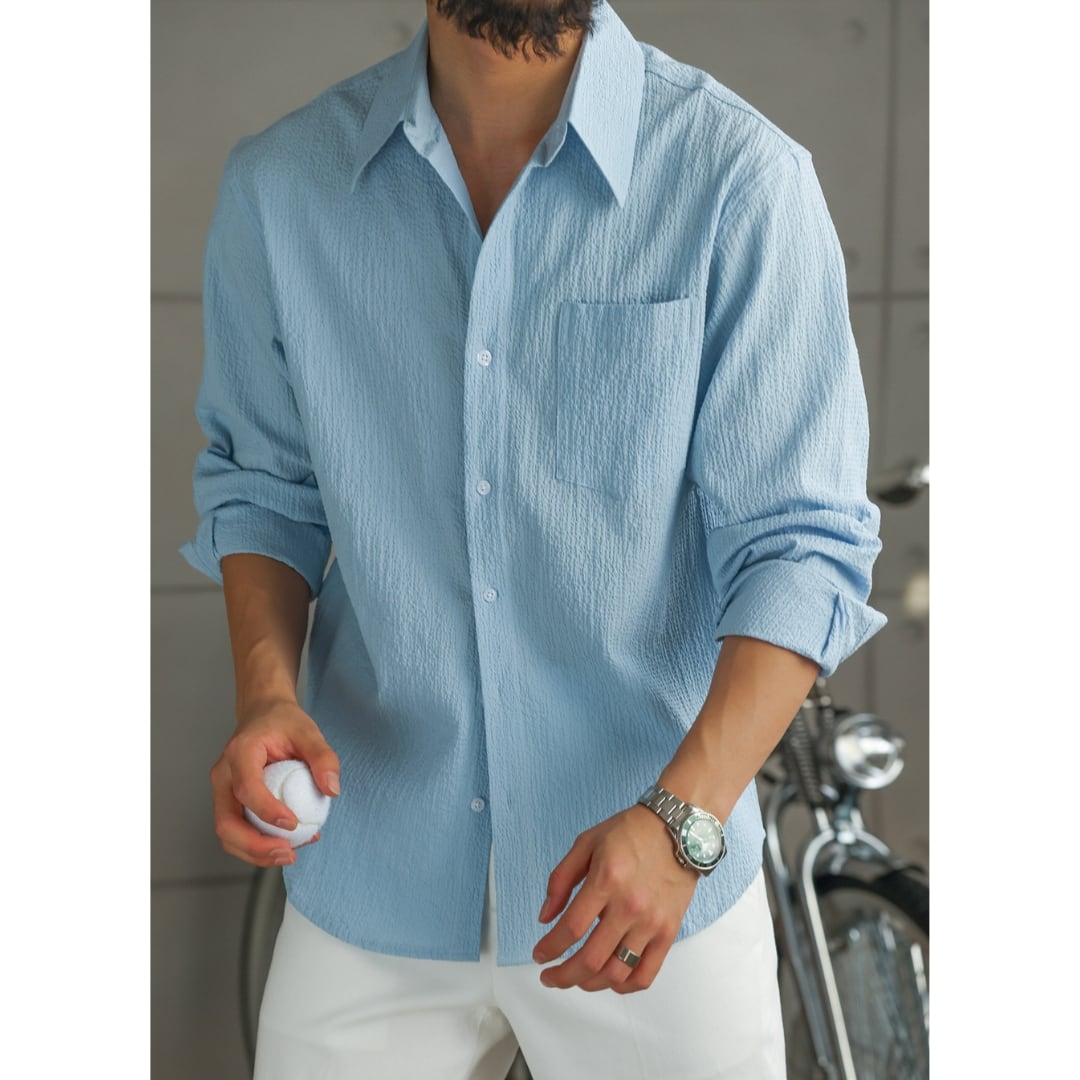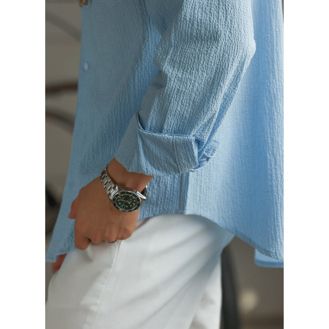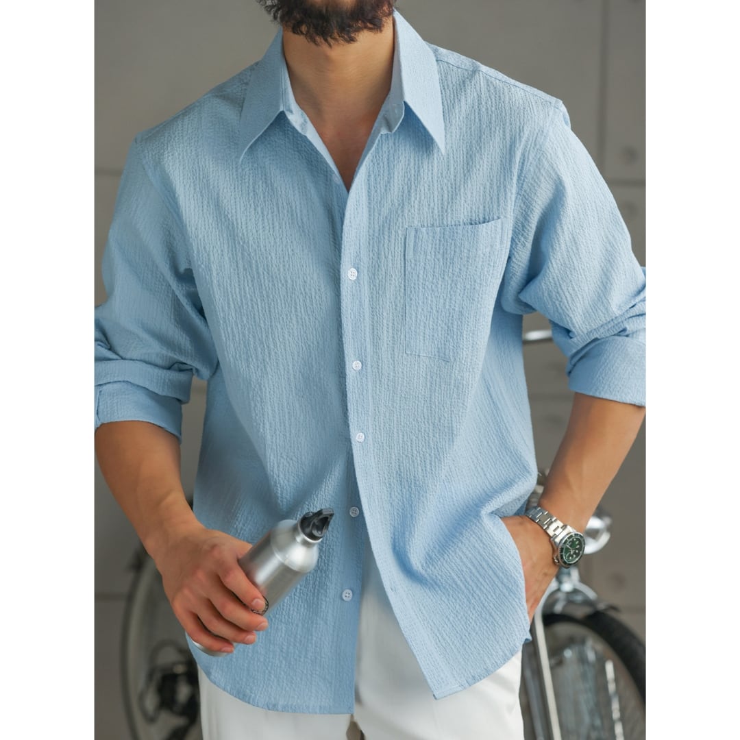 表情のある凹凸生地が肌離れを良くし、軽く涼しい着心地を実現したライトシャツ。
