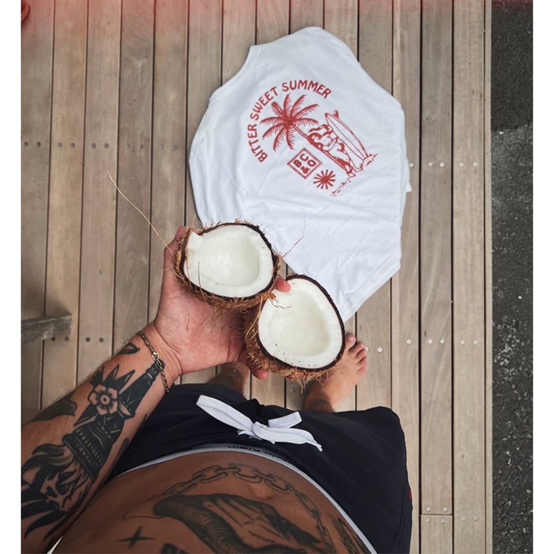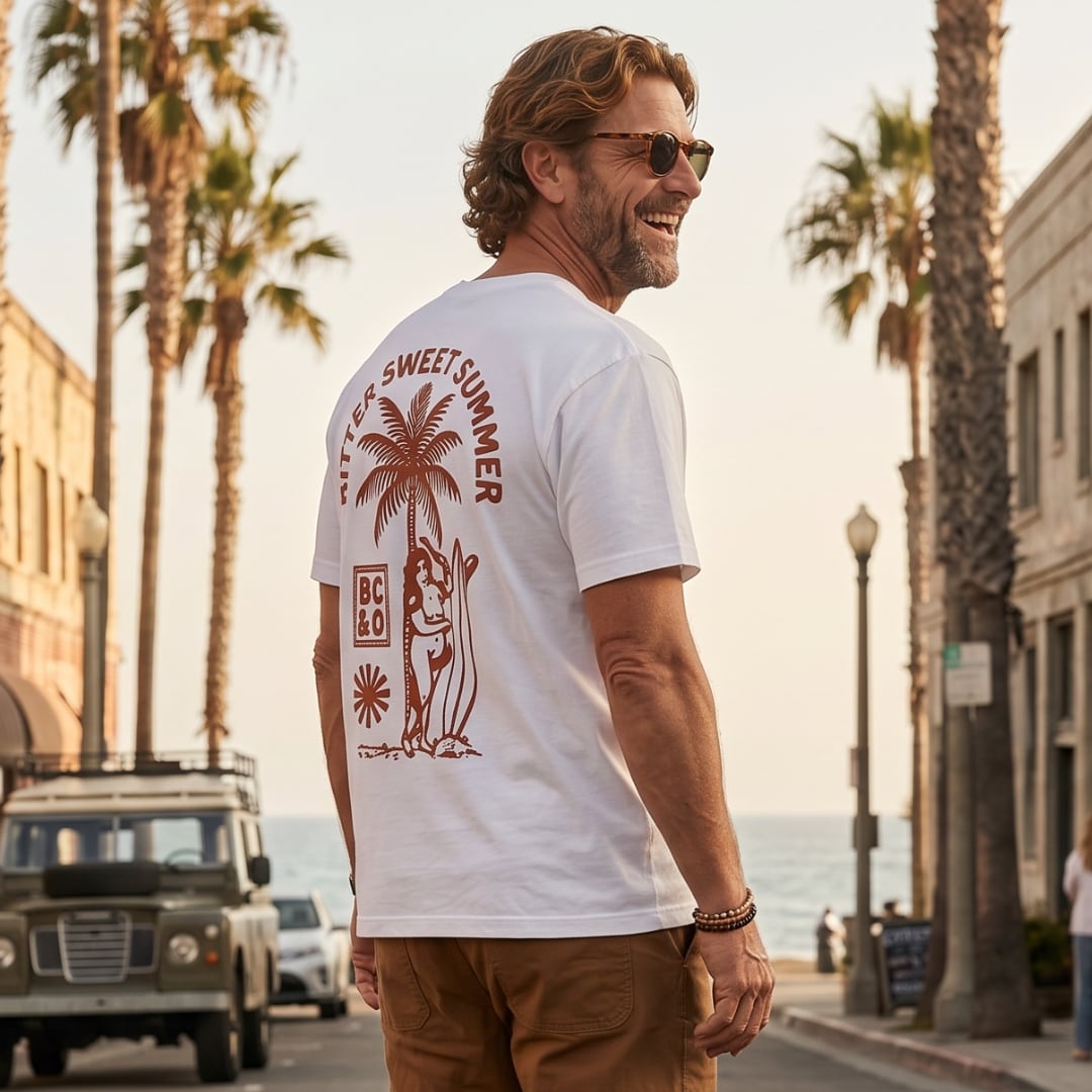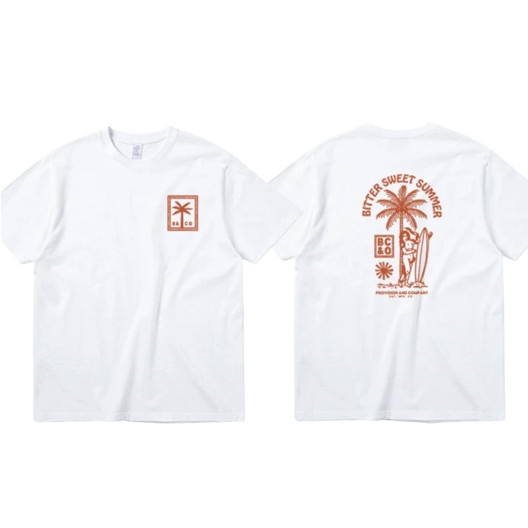 バックには夏を感じさせるプリントを配置し、軽さと遊びのバランスを取った一枚です。